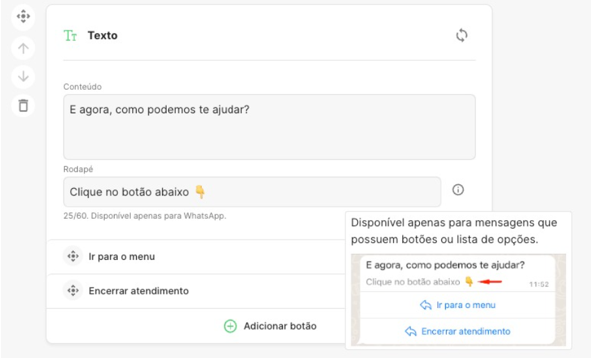 Foi disponibilizado a funcionalidade de incluir um rodapé dentro do elemento de Texto do módulo de Chat. Essa melhoria permite trazer uma informação mais precisa ou alguma observação que ajude o usuário na escolha de qual opção selecionar. Está disponível apenas para mensagens que possuem botões ou lista de opções.                                                               &#x20;